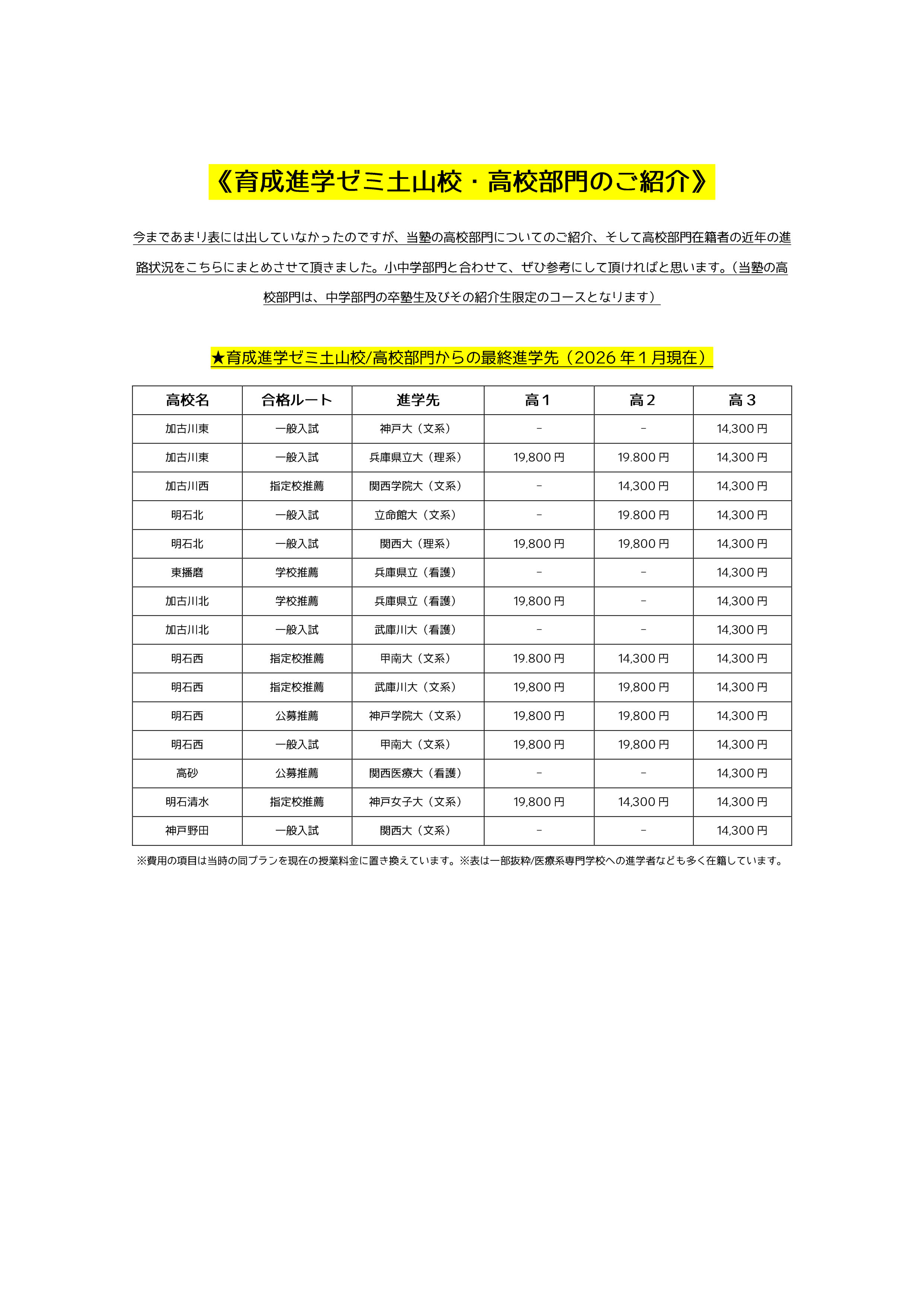 【公立高校・進学先一覧(2015〜2024年度)】加印地区加古川東:8名 加古川西:6名 東播磨:17名 加古川北:12名 加古川南:3名 高砂南:3名 高砂:5名 播磨南:14名 県立農業:8名 …